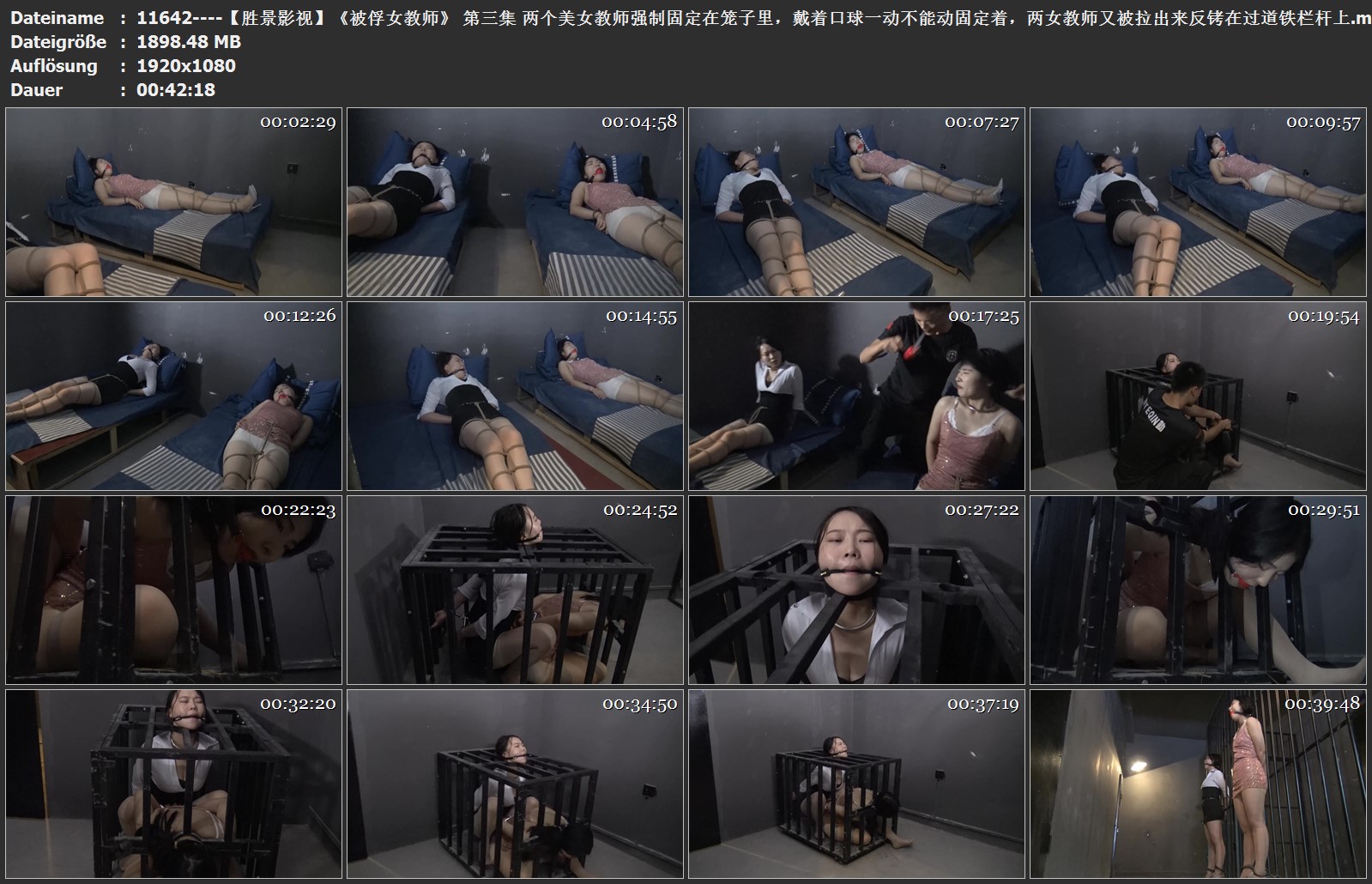 【胜景影视】《被俘女教师》 第三集 两个美女教师强制固定在笼子里,戴着口球一动不能动固定着,两女教师又被拉出来反铐在过道铁栏杆上