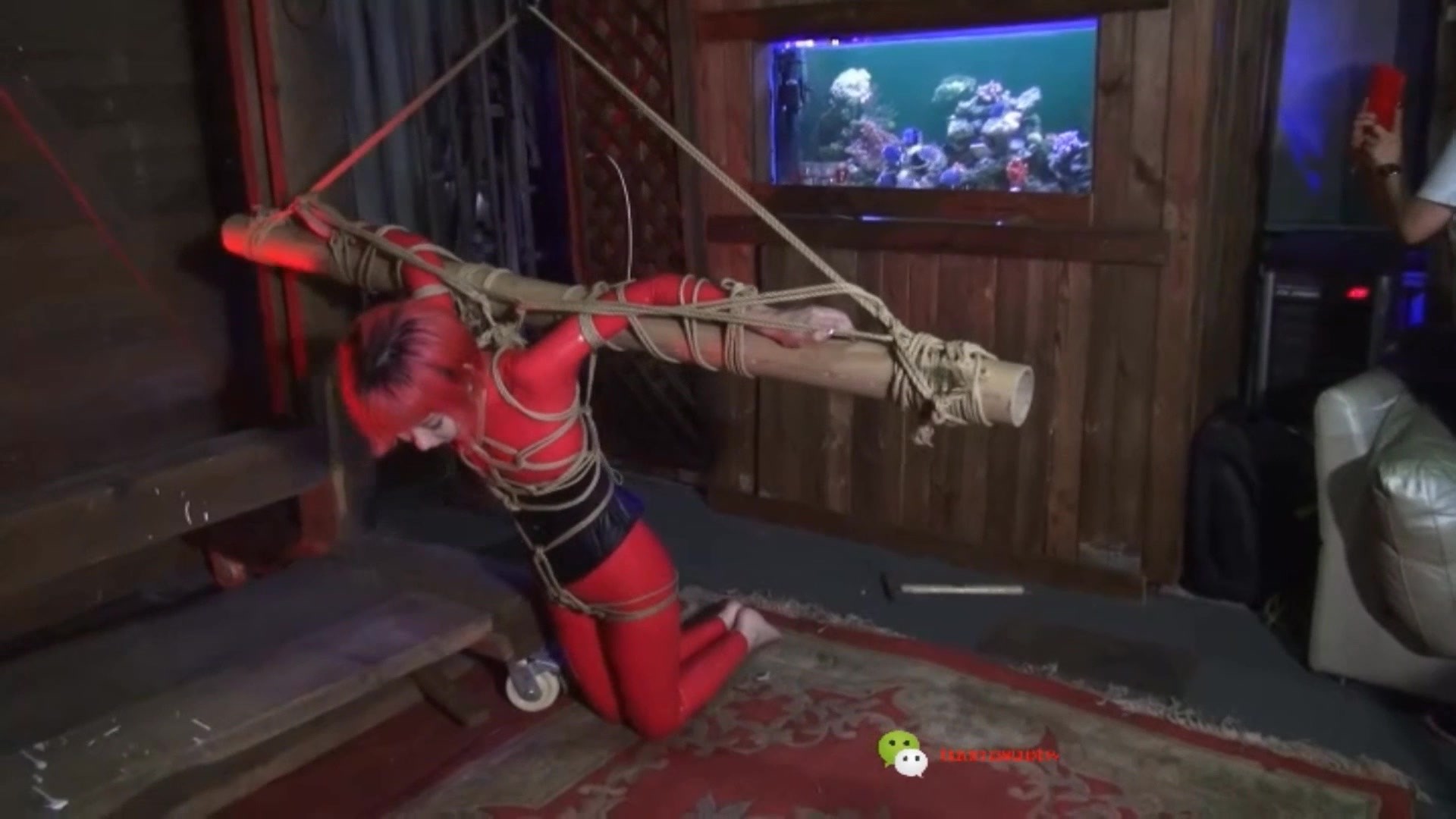红色胶衣美女一字捆绑悬吊,凄楚美丽在精湛的绳艺技艺下彰显的淋漓极致,是不多得的