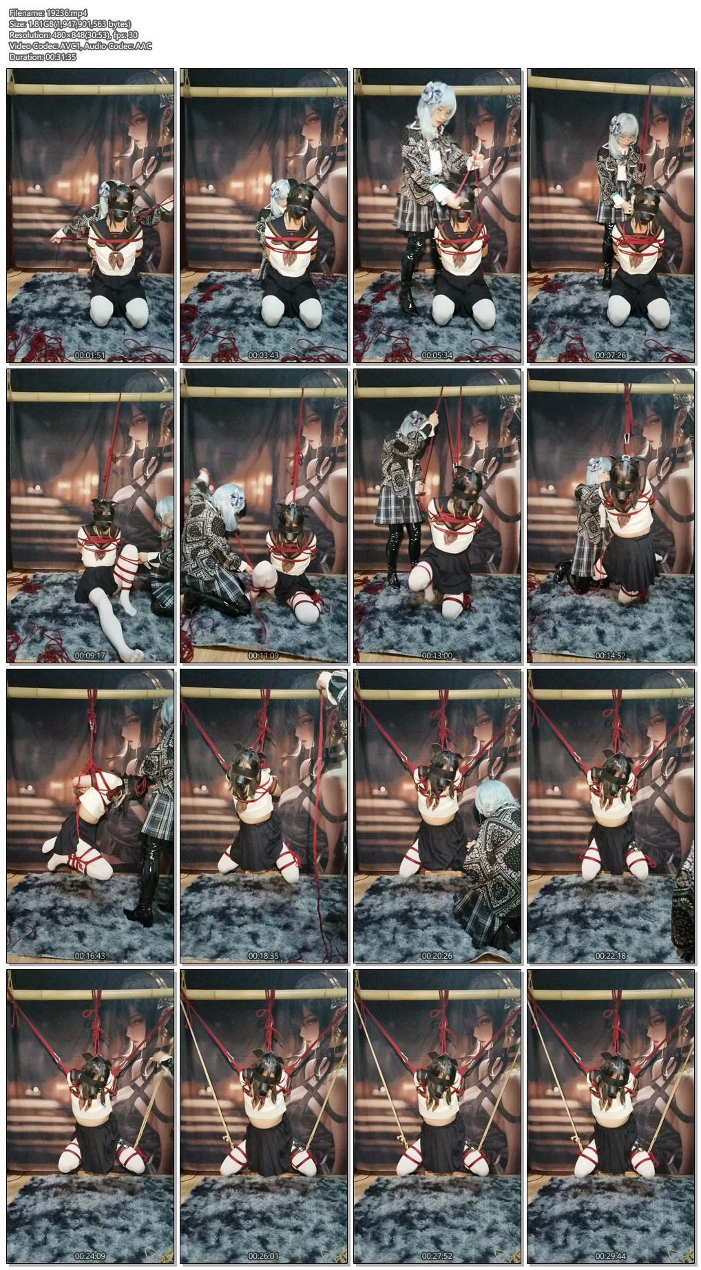 芝士士被大s聆蒙住了双眼,日式后手+双折腿拉高就变成了任人摆布的小玩具了~起吊后加了几根辅力绳固定与支撑,如此~完全紧缚的驷马直吊便完成了!那么无奖竞猜:芝士在五蛋训练器和郊狼的迫害下去了多少次呢?