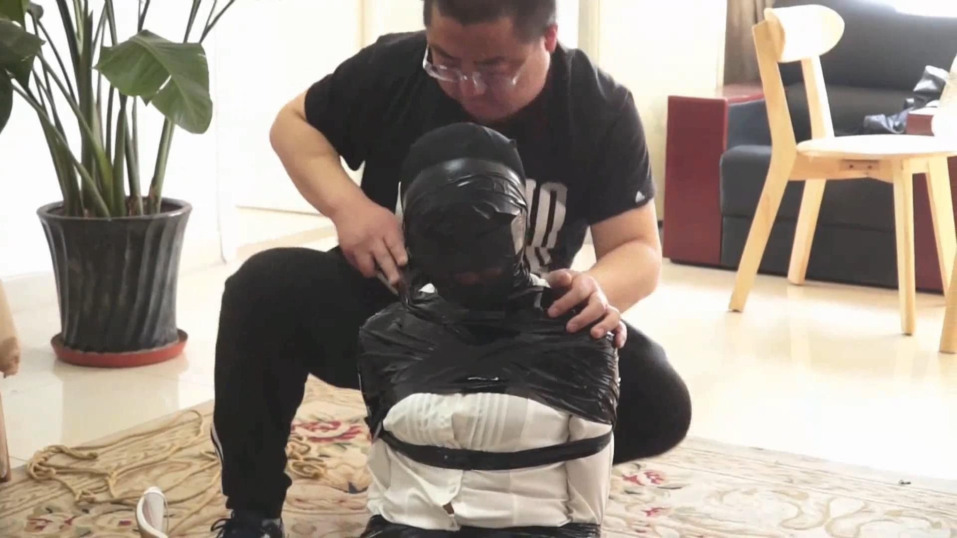 白领被黑丝袜蒙住头,胶带蒙眼堵嘴后,又被黑色胶带一圈一圈裹成了木乃伊,毫无逃脱可能。最后被封在木柱上,用胶带和保鲜膜固定,只能像一件展品一样供人观赏了......