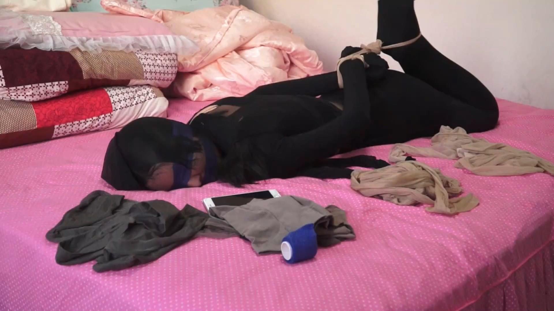 "领衔主演:佟亚、杜扬 前情提要:上集中佟亚讽刺嘲笑了杜扬所饰演的推销员卖的丝袜,结果被恼羞成怒的杜扬按在地上制服迷晕并捆绑堵嘴了起来。 这集中推销员先是解开了佟亚身上的束缚将她放置在椅子上,然后强迫和她做交易,居然要求她将今后十年要穿的丝袜都在自己这买了,佟亚一听觉得这个女人肯定是疯了,我买那么多袜子难道是拿来吃的啊!果断拒绝了...这可又把推销员惹怒了,用丝袜把佟亚小嘴堵上了以后自己在家翻箱倒柜找财物,结果找到了一张银行卡,然后拿着刀去威胁被绑在客厅椅子上的佟亚,佟亚担心推销员会伤害自己于是就给出了密码,杜扬取完了钱以后回来怕佟亚报警于是一不做二不休将她迷晕后拖到房间内,用黑色丝袜套满她全身,又将她驷马捆绑堵嘴了起来,最后杜扬在佟亚脸上亲了一下就离开了,留下被捆绑堵嘴的佟亚在床上慢慢挣扎等死。"