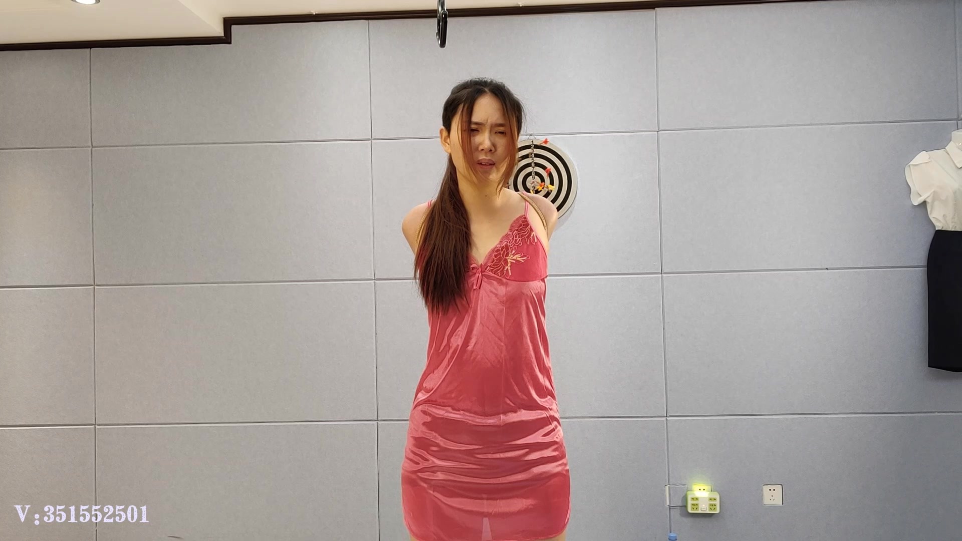很久不见的孟芳,很久没有虐了,穿上性感睡衣,狠狠的捆了个直臂,再高高吊起,大腿捆绑,弯腰吊着,口球堵嘴,这种情况下,孟芳只能不断的流出口水,伴随着痛苦的哀嚎。真正的绳虐