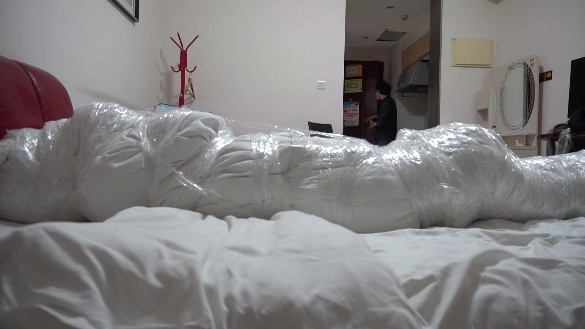 小萌在床上挣扎了几下,摔下来床,她什么都看不见,只能漫无目的蠕动前进,寻找出口,这期间她撞到过桌椅,也撞到过沙发,盗贼这时候吃完饭回来了,看到了正在蠕动的白色蚕宝宝,笑着又把小萌拖了回去,剥去了保鲜膜,用绳子重新把小萌捆上,再把裹着被子的小萌放在了椅子上坐了起来,再用绳子把她绑在了椅子的靠背上,再次开始了新一轮的折磨。
